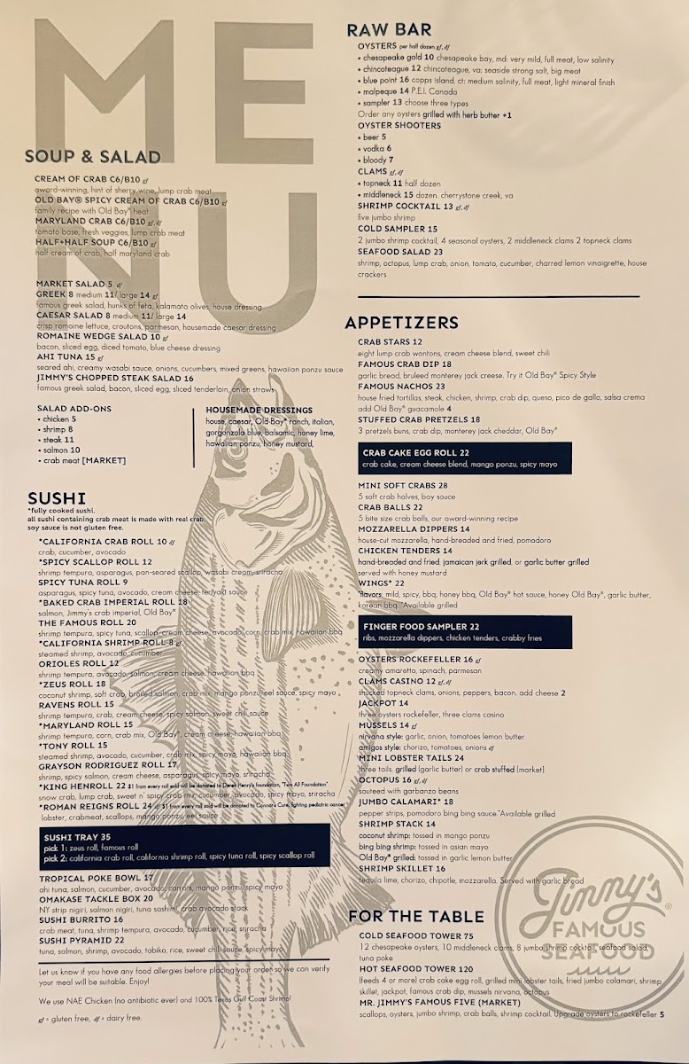 Menus also feature inventive takes on classic favorites, including burgers topped with signature crab dip or mini crab cakes, showcasing the brand’s focus on fresh seafood integrated into familiar comfort food formats. Whether during a lively game day or a quiet evening, the menu’s range supports a versatile dining experience that emphasizes taste and approachability in equal measure.